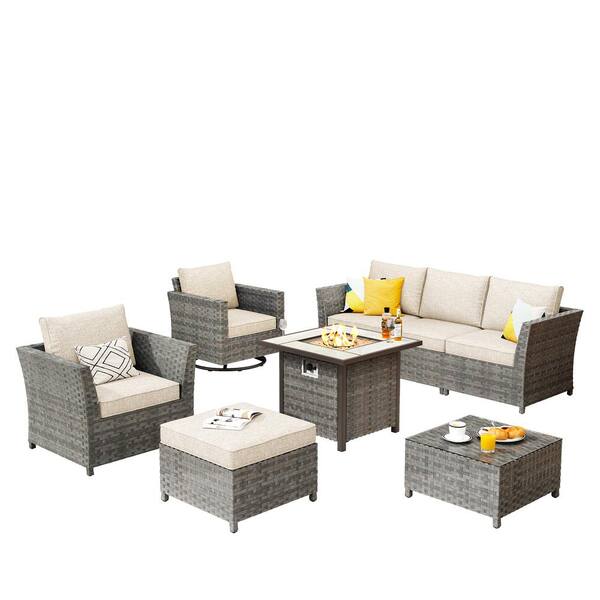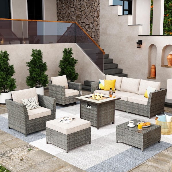 Fontainebleau Gray 8-Piece Wicker Outerdoor Patio Fire Pit Set with Beige Cushions and Swivel Rocking Chairs
