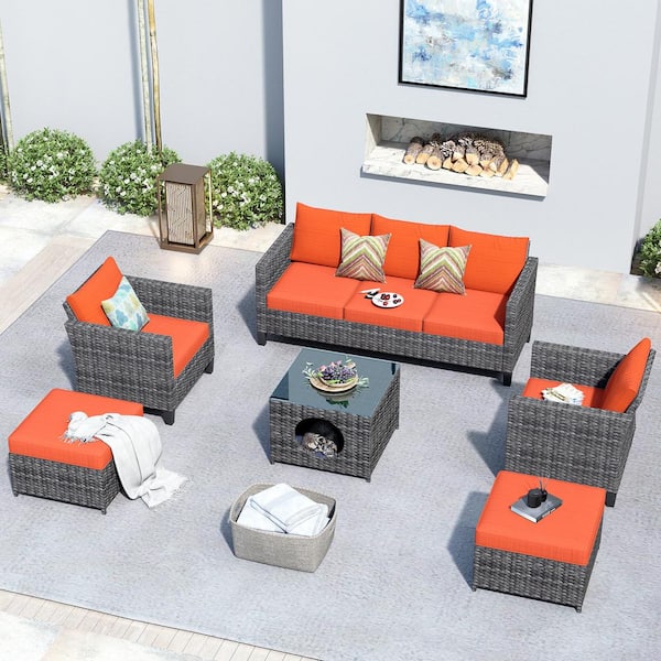 Gaia Gray 6-Piece Wicker Outdoor Patio Conversation Seating Set with Orange Red Cushions