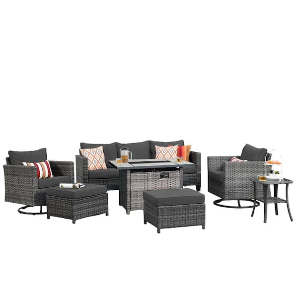 Hyperion 7-Piece Wicker Patio Rectangular Fire Pit Set and with Black Cushions and Swivel Rocking Chairs