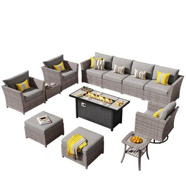 Jasmine 12-Piece Wicker Patio Rectangular Fire Pit Set with Dark Gray Cushions and Swivel Rocking Chairs