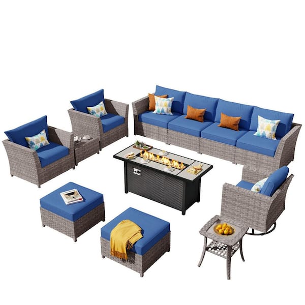 Jasmine 12-Piece Wicker Patio Rectangular Fire Pit Set with Navy Blue Cushions and Swivel Rocking Chairs