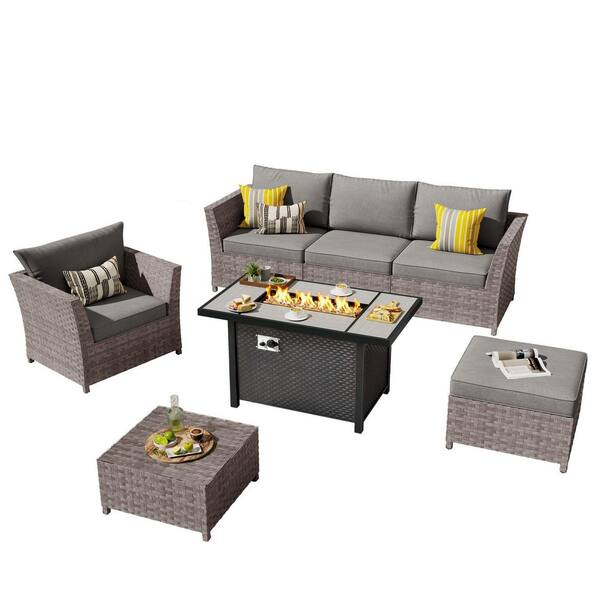 Jasmine 7-Piece Wicker Outerdoor Patio Rectangular Fire Pit Set with Dark Gray Cushions