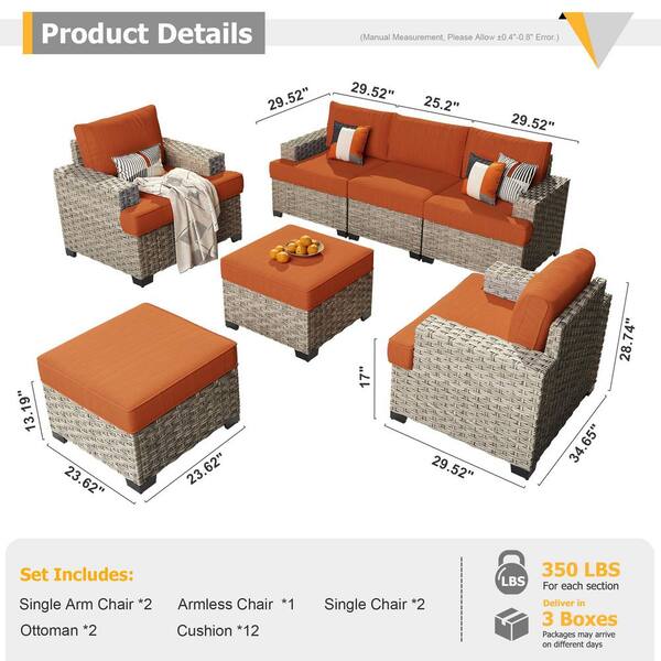 Kairos 7-Pieces Wicker Outdoor Patio Conversation Seating Set with Orange Red Cushions