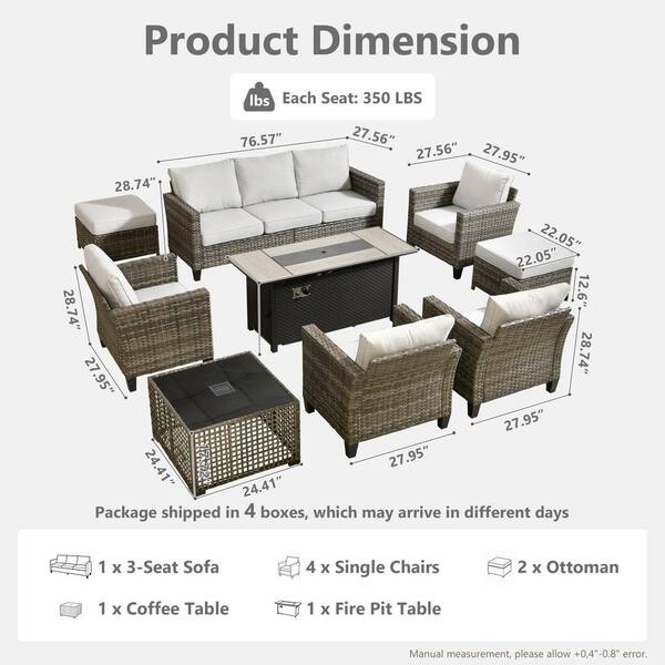 Limerence 9 Pieces Wicker Outdoor Patio Rectangular Fire Pit Set with Gray Cushions