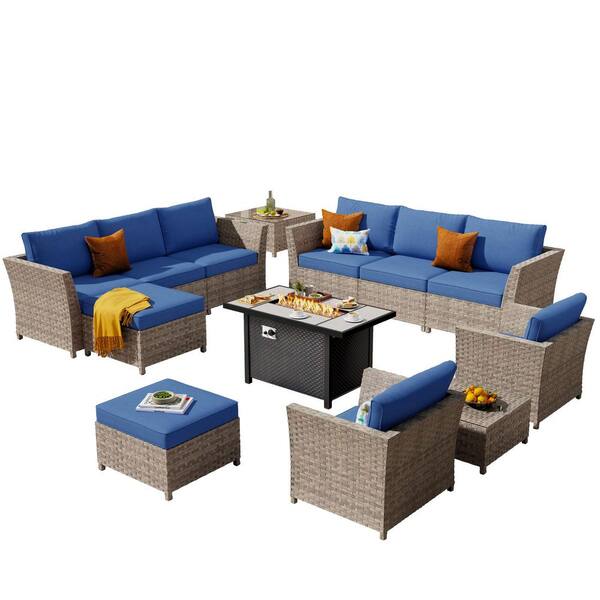 Lounge 13 Pieces Wicker Outdoor Patio Rectangular Fire Pit Set with Navy Blue Cushions