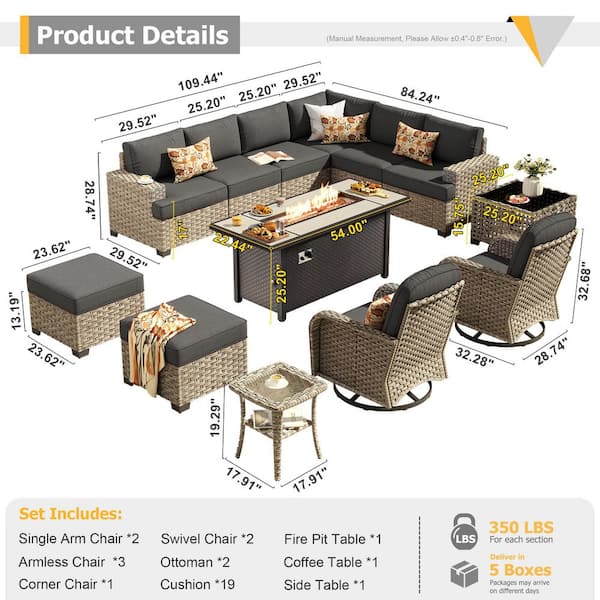 Lumisole 13 Pieces Wicker Rectangular Fire Pit Sets and Swivel Rocking Chairs with Black Cushion