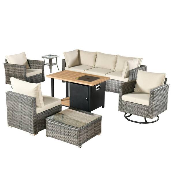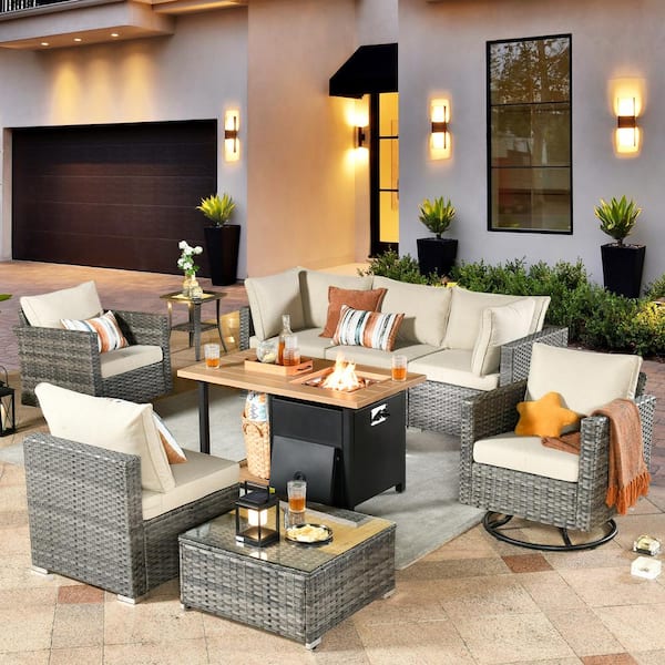 Lydia Gray 9-Piece Wicker Patio Rectangular Fire Pit Set with Beige Cushions and Swivel Rocking Chairs