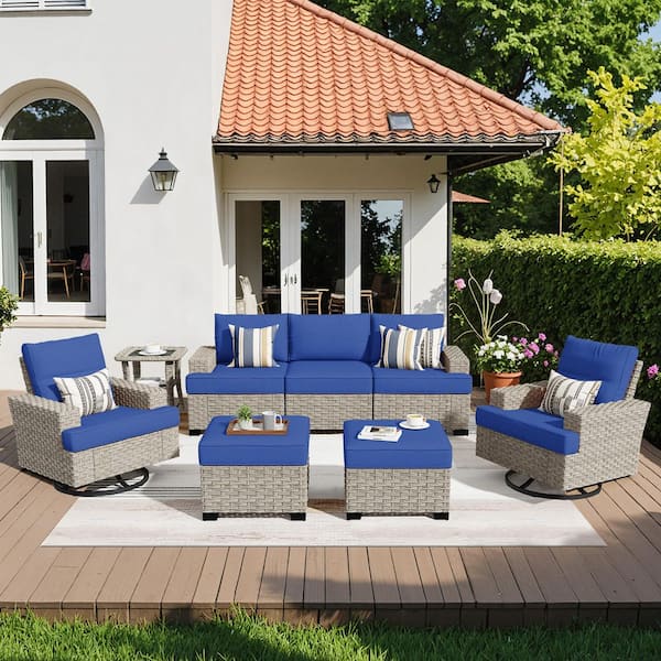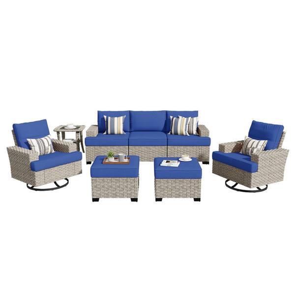 Mettle 8-Piece Wicker Patio Conversation Seating Sofa Set with Navy Blue Cushions and Swivel Rocking Chairs