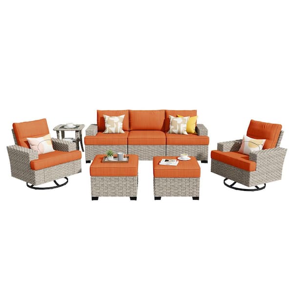 Mettle 8-Piece Wicker Patio Conversation Seating Sofa Set with Orange Red Cushions and Swivel Rocking Chairs