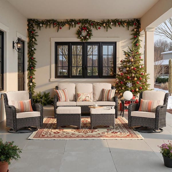 Moonlight Brown 6-Piece Wicker Patio Conversation Seating Sofa Set with Beige Cushions and Swivel Rocking Chairs