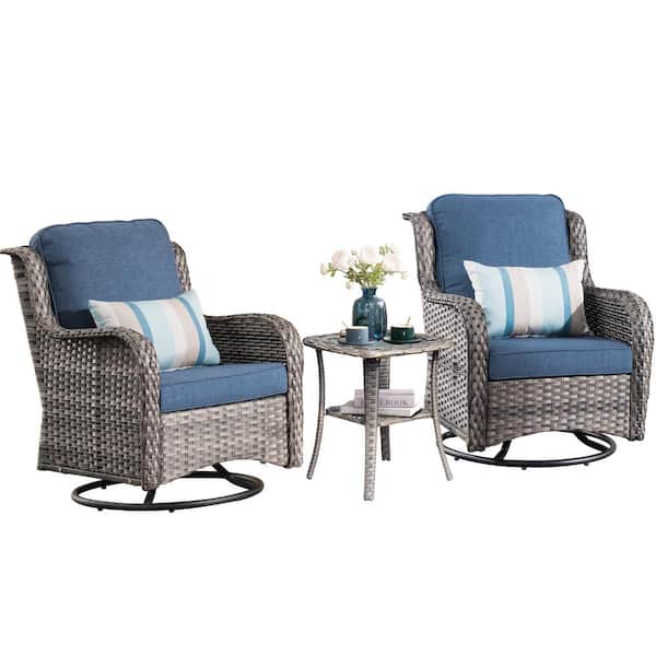 Moonlight Gray 3-Piece Wicker Patio Conversation Seating Sofa Set with Denim Blue Cushions and Swivel Rocking Chairs
