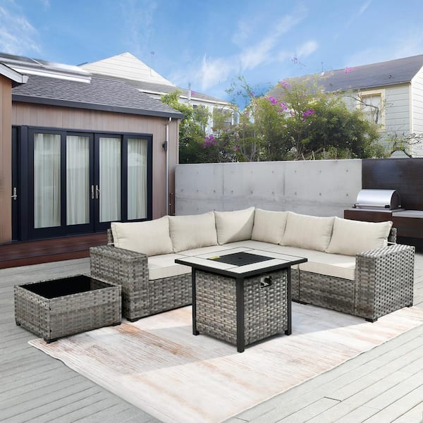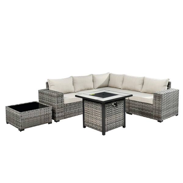 Moonriver 7-Piece Wicker Outdoor Patio Fire Pit Conversation Sectional Sofa Set with Beige Cushions