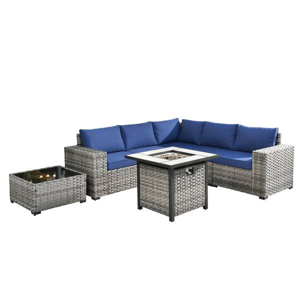 Moonriver 7-Piece Wicker Outdoor Patio Fire Pit Conversation Sectional Sofa Set with Navy Blue Cushions