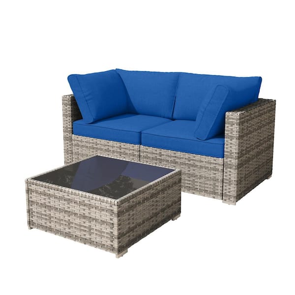 Nestle 3 Pieces Wicker Patio Conversation Seating Sofa Set with Navy Blue Cushions and Coffee Table