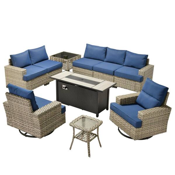 Novique 10-Pieces Wicker Rectangular Fire Pit Sets and Swivel Rocking Chairs with Navy Blue Cushion