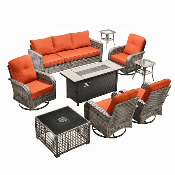 Onyx 9 Pieces Wicker Outdoor Patio Rectangular Fire Pit Set and Swivel Rocking Chairs with Orange Red Cushions