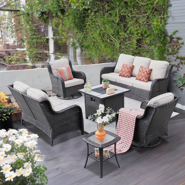 Pluto Brown 6-Piece Wicker Patio Fire Pit Set with Beige Cushions and Swivel Rocking Chairs