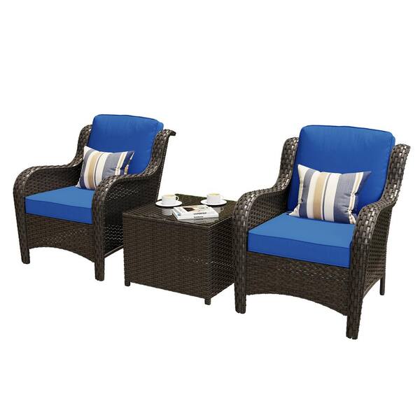 Polar 3-Piece Brown Wicker Patio Conversation Set with Navy Blue Cushions and Coffee Table