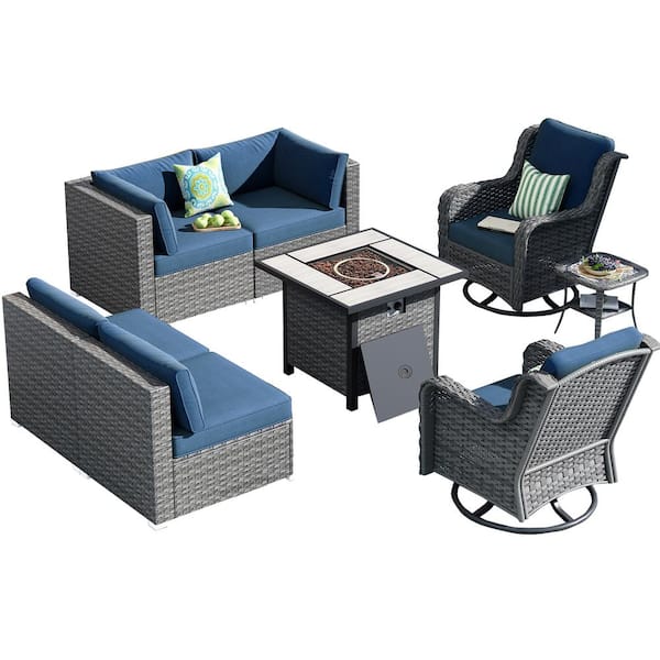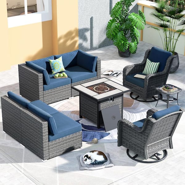 Poseidon Gray 8-PieceWicker Outerdoor Patio Fire Pit Set and with Denim Blue Cushions and Swivel Rocking Chairs