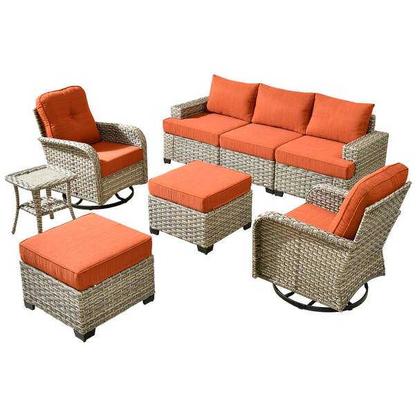 Scorpio 8-Piece Wicker Patio Conversation Seating Sofa Set with Orange Red Cushions and Swivel Rocking Chairs
