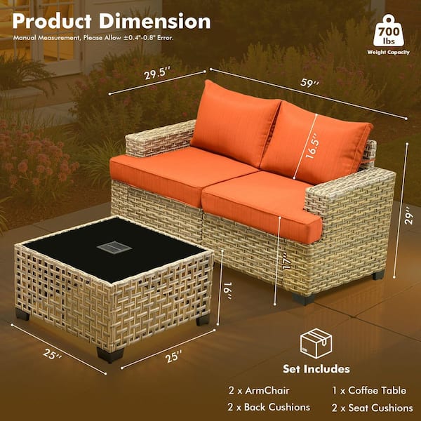 Solstice Wicker Outdoor Patio Sofa with Orange Red Cushions and Coffee Table