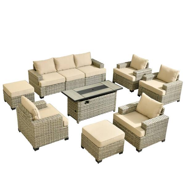 Taylor 10-Piece Wicker Patio Rectangular Fire Pit Set with Beige Cushions