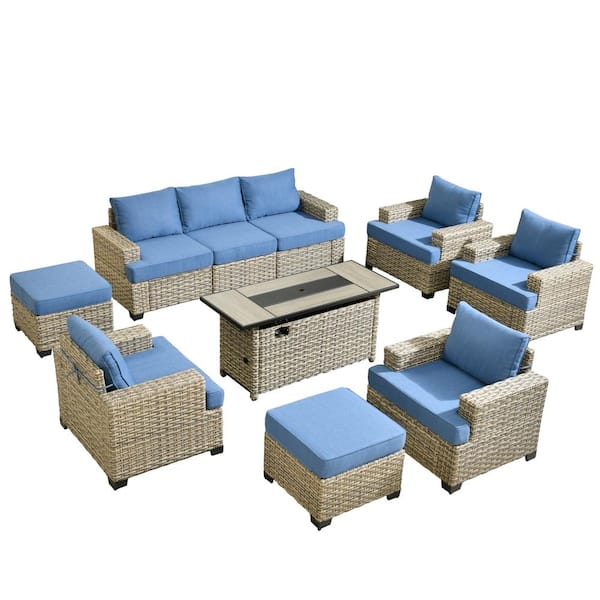 Taylor 10-Piece Wicker Patio Rectangular Fire Pit Set with Blue Cushions