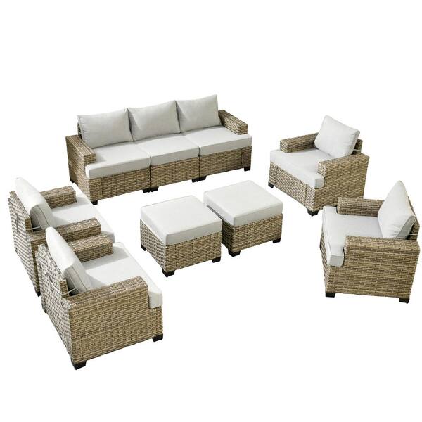 Taylor 9-Piece Wicker Outdoor Patio Conversation Seating Set with Light Gray Cushions