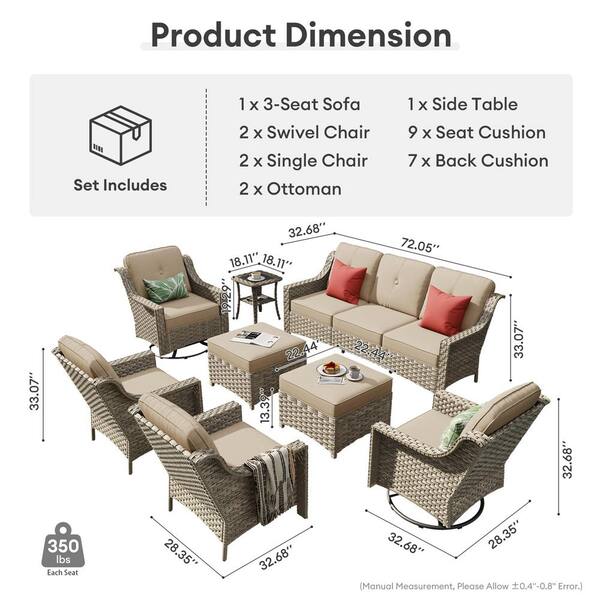 TranquilNest 8 Pieces Wicker Patio Conversation Seating Sofa Set with Beige Cushions and Swivel Rocking Chairs