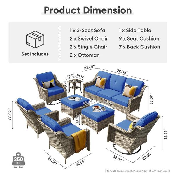 TranquilNest 8 Pieces Wicker Patio Conversation Seating Sofa Set with Diamond Blue Cushions and Swivel Rocking Chairs