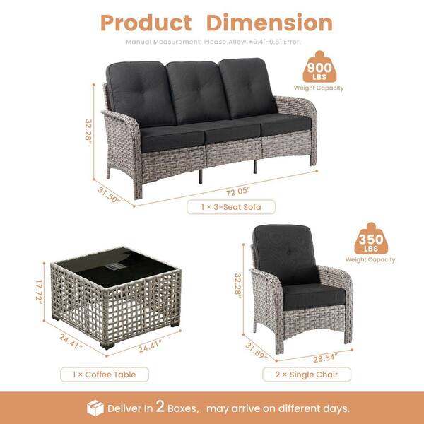 Vera 4-Piece Wicker Patio Conversation Seating Sofa Set with Black Cushions and a Led Table