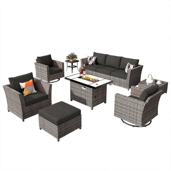 Vesta Gray 10-Piece Wicker Outerdoor Patio Rectangular Fire Pit Set with Black Cushions and Swivel Rocking Chairs