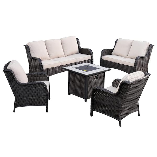 Vincent Brown 5-Piece Wicker Patio Fire Pit Outdoor Seating Sofa Set and with Beige Cushions