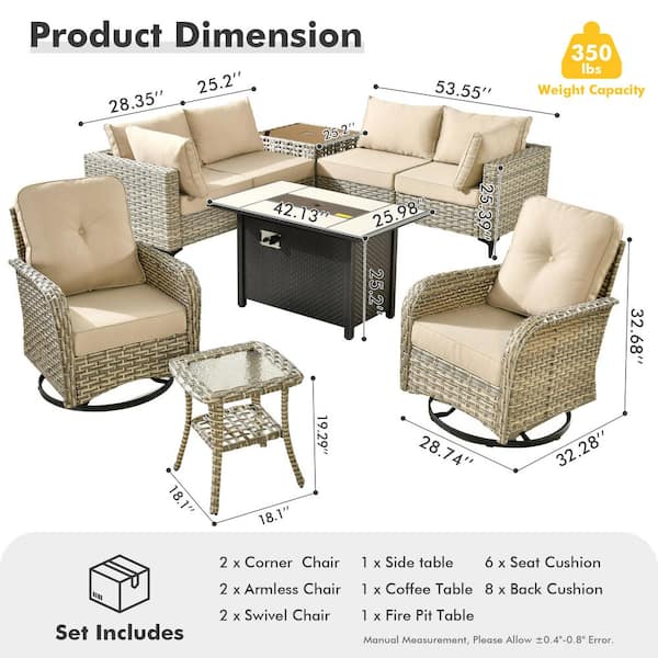 Vintage 9 Pieces Wicker Outdoor Patio Rectangular Fire Pit Set and Swivel Rocking Chairs with Beige Cushions