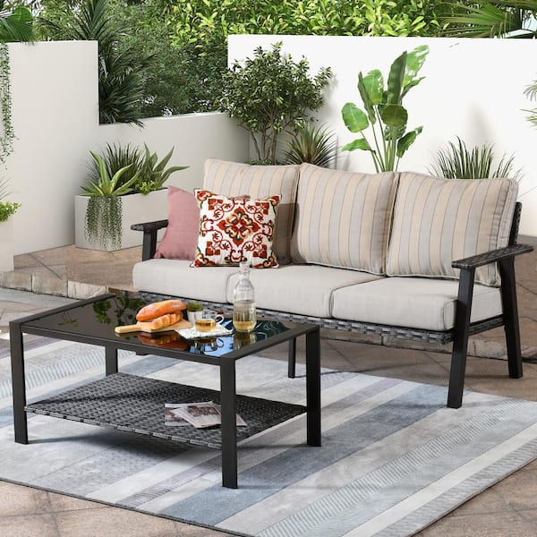 Xavier Gray 2-Piece Wicker Outdoor Patio Conversation 3-Seat Sofa with Beige Cushion and Table