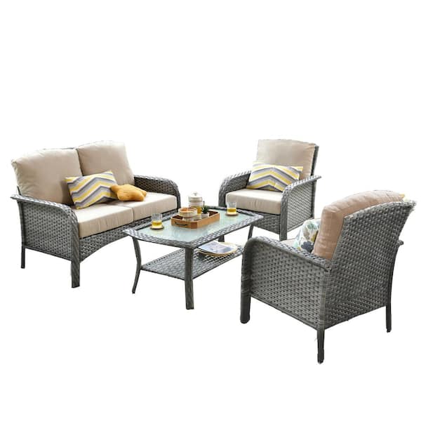 Zora 4-Piece Wicker Patio Conversation Seating Sofa Set with Beige Cushions and Table