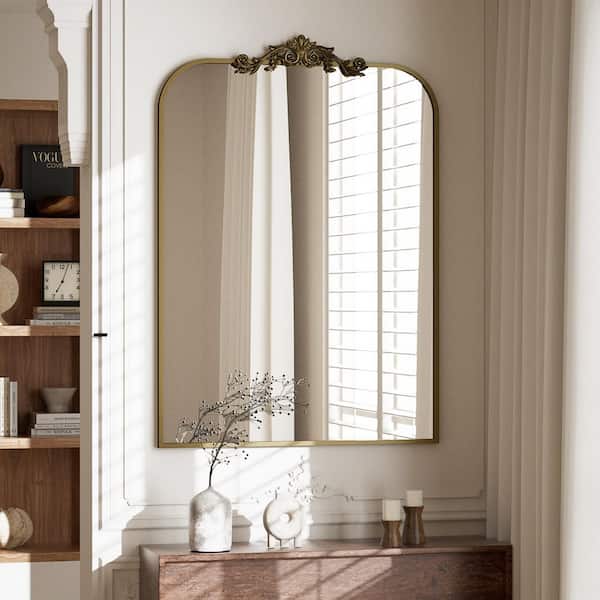 24 in. W x 36 in. H Modern Rectangular Rounded-Top Brown Metal Framed with Carved Decoration Vanity Wall Mirror