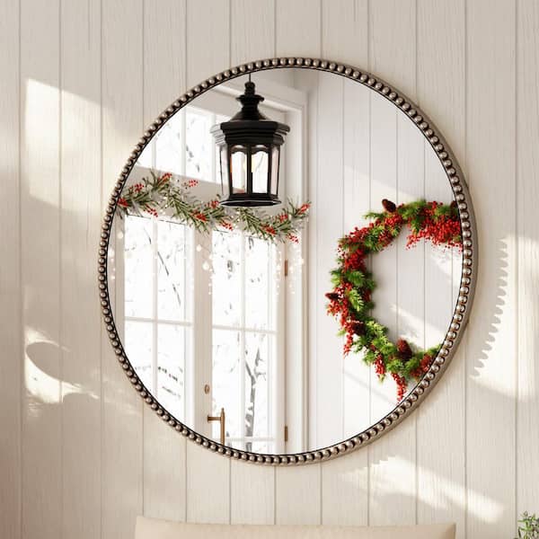 Antique Silver 32 in. W x 32 in. H Round With Decoration Vanity Wall Mirror Polyurethane Framed Mirror