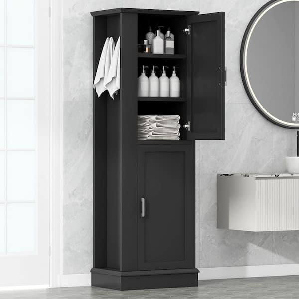 21 in. W x 14 in. D x 68 in. H Black Linen Cabinet, Tall Bathroom Storage Cabinet with Hook, Adjustable Shelf, MDF Board
