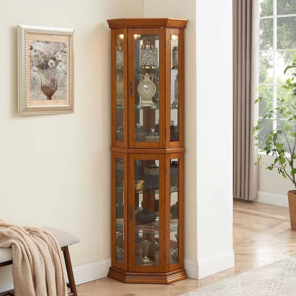 22 in. W x 16 in. D x 70 in. H Brown Linen Cabinet, Corner Curio Cabinet with Lights, Display Cabinet with Glass Shelves