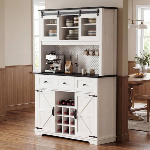 47 in. W x 14 in. D x 71 in. H White Wood Linen Cabinet with Sliding Door, 2 Power Outlet, Wine & Glasses Rack in White