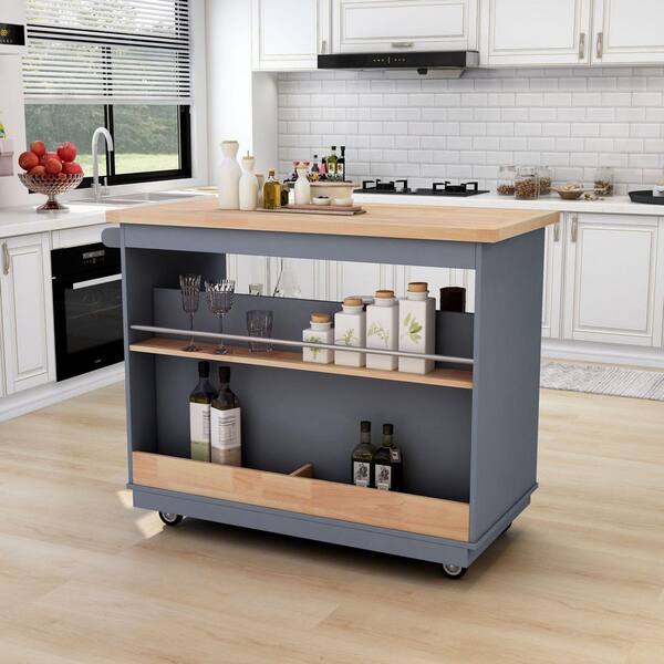 Blue Wood 46 in. Kitchen Island with Rubber Wood Top, 3 Open Compartments and 2 Drawers for Kitchen and Dining Room