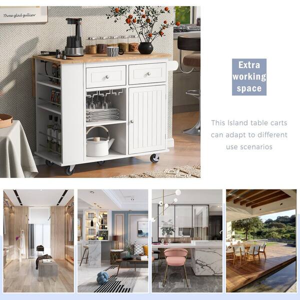 White Wood 40 in. Kitchen Island with 3-Power Outlet, Drop Leaf, Adjustable Shelves and Wine Rack for Kitchen Room