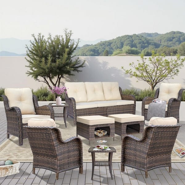 Brown 9-Piece Wicker Outdoor Patio Conversation Seating Set with Beige Cushions