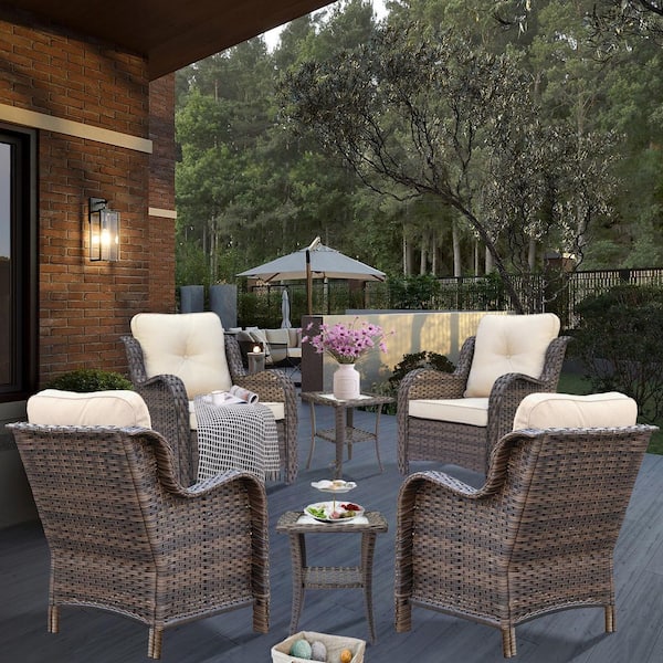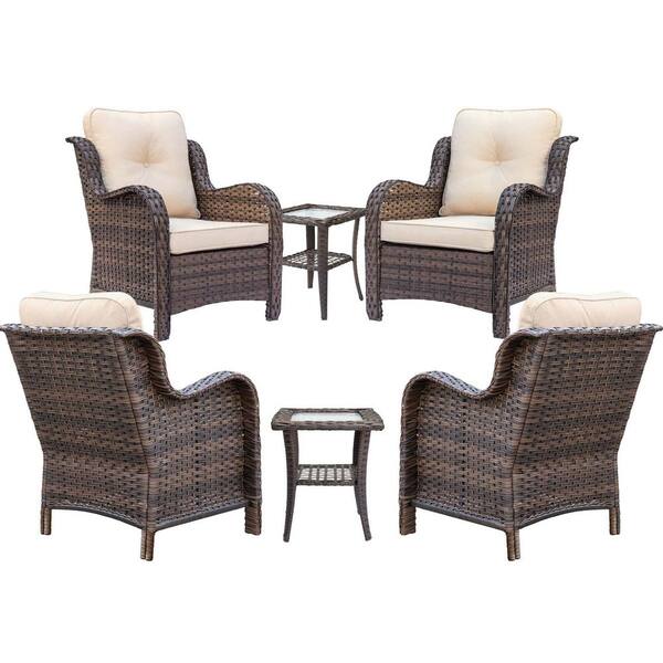 Rattan Brown 6-Piece Wicker Outdoor Patio Conversation Seating Set with Beige Cushions