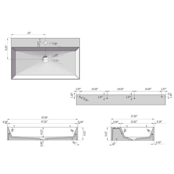 Moray 48 in. Solid Surface Wall Mount Vessel Rectangle Bathroom Sink with Faucet Hole in Matte White