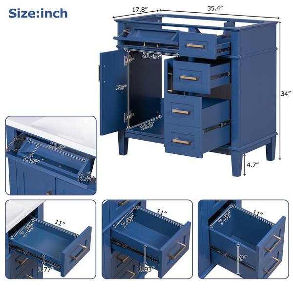 35.4 in. W Bath Vanity Cabinet without Top in Blue with Flip-Out Drawer, 3-Drawers, 2-Doors