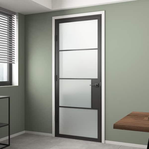 36 in. x 84 in. Left-Handed Matte Black Steel Single Prehung Interior Door with 4-Lite Frosted Glass, Turn Lock