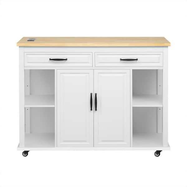 White Wood 47 in. Kitchen Island with Power Outlet, Extendable Dining Table, 2 Doors and 2 Drawers