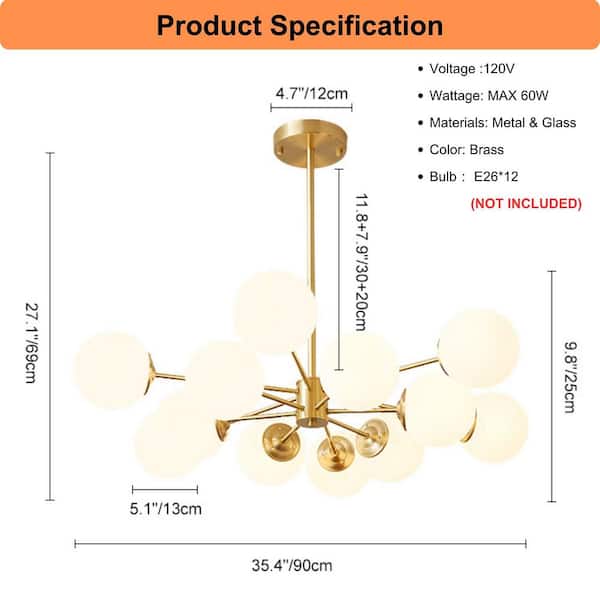 12-Light Brass Mid-Century Sputnik Chandelier Modern Globe Pendant Light Fixture for Bedroom with Frosted Glass Shades